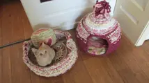 - Prachtige en leuke handmade design katten- honden- en knaagdieren hutjes/iglos en huisjes. Ieder hutje is voorzien van een (los) kussentje wat apart uitgewassen kan worden. De hutjes zijn gehaakt van (repen) katoen, wol of andere stof. Om inzakken te voorkomen zijn ze extra verstevigd met bijv. geplastificeerd (ijzer)draadmateriaal e.d. En kunnen daarmee ook in model gebogen worden.