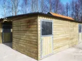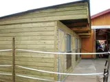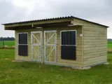 Details: luifel 1,20 meter, dak van asbestvrije golfplaten, buitenwanden van geïmpregneerde rabbatdelen. De binnenwanden zijn standaard met multiplex bekleed, meerprijs betonplex: € 75,- per stal.