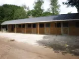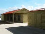 Luifel 2,32 meter met stutpalen. Dak van asbestvrije golfplaten, buitenwanden van geïmpregneerde rabbatdelen. De binnenwanden zijn standaard bekleed met multiplex, meerprijs betonplex: € 75,- per stal.