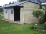 Luifel 1,00 meter, dak van asbestvrije golfplaten, buitenwanden van geïmpregneerde rabbatdelen. De binnenwanden zijn standaard met multiplex bekleed, meerprijs betonplex: € 75,- per stal.