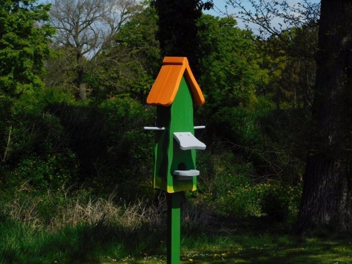 Dit vogelhuis heeft een totale hoogte van 180cm (incl. tuinsteker) en is handgemaakt!