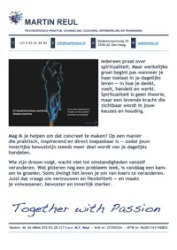 Iedereen praat over spiritualiteit. Maar werkelijke groei begint pas wanneer je haar toelaat in je dagelijks leven — in hoe je denkt, voelt, handelt en werkt. Spiritualiteit is geen theorie, maar een levende kracht die zichtbaar wordt in jouw keuzes en houding. Mag ik je helpen om dat concreet te maken? Op een manier die praktisch, inspirerend en direct toepasbaar is — zodat jouw innerlijke bewustzijn steeds meer deel wordt van je dagelijks handelen. Wie zijn droom volgt, wacht niet tot omstandi ...