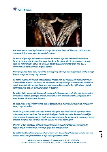 Maar die andere hand dan? vraagt hij nieuwsgierig. Dat zijn mijn zegeningen, wilt u die ook horen? vraagt ze. Graag, zegt de arts.