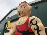 Deze 3,5 meter hoge Abraham pop aso valt goed op met zijn tattoo en mobiele telefoon in z’n hand. Om het extra te benadrukken dat deze pop een tikkeltje aso of flodder is, hebben we de Aso Abraham aangekleed met een trainingspak en rood opvallend hemd.