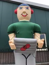 De opblaasbare Abraham pop Gamer heeft enkele duidelijke kenmerken van een gamer meegekregen. Kijk maar naar zijn headset en kledingstijl.