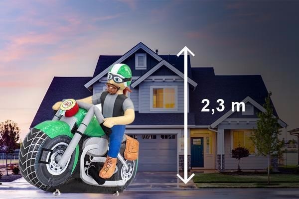 Met 2 personen is deze pop eenvoudig op te zetten. Binnen een paar minuten heb je een gigantische opblaas motor pop in de tuin staan.
