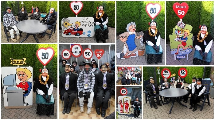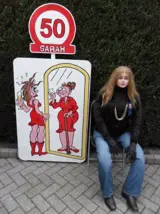 LET OP ! 3 DELIGE abraham of sarah FEESTVERSIERSET { tuinversierset } bestaat uit een levensgrote abrahampop of sarahpop naar keuze, een verkeersbord 50 op paal naar keuze, en bijv een feestbord met een afbeelding van abraham of sarah die zich in de spiegel ziet geweldige keuze bekijk eens mijn andere advertenties LET OP ! deze 3 delige tuinversierset is geheel naar eigen smaak door u samen te stellen geweldige keuze, en kost voor 4 dagen huren maar 25 euro.