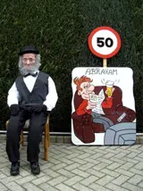 LET OP ! 3 DELIGE abraham of sarah FEESTVERSIERSET { tuinversierset } bestaat uit een levensgrote abrahampop of sarahpop naar keuze, een verkeersbord 50 op paal naar keuze, en bijv een feestbord met een afbeelding van abraham of sarah die zich in de spiegel ziet geweldige keuze bekijk eens mijn andere advertenties LET OP ! deze 3 delige tuinversierset is geheel naar eigen smaak door u samen te stellen geweldige keuze, en kost voor 4 dagen huren maar 25 euro.