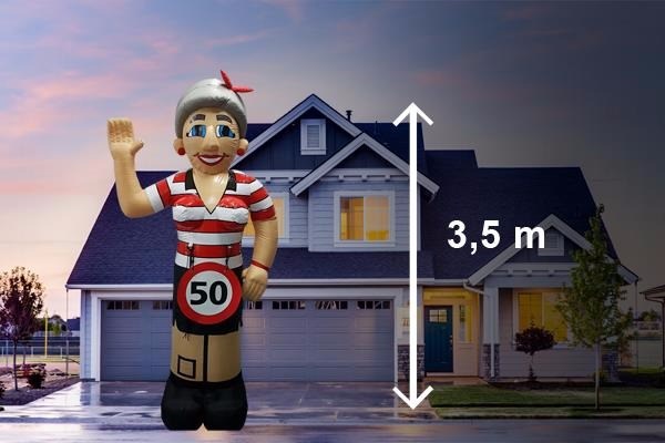 De opblaaspop is gekleed in een opvallend gestreept shirt, daardoor springt ze er echt uit in de tuin van de jarige.