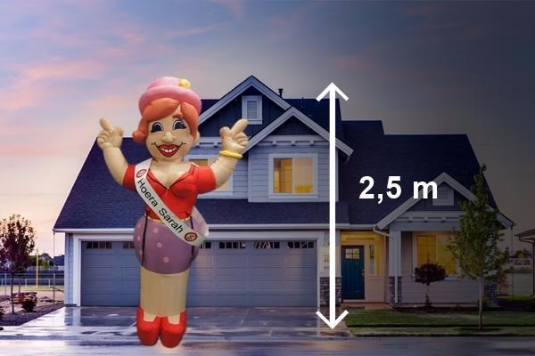 Deze compacte Sarah pop party is slechts 2,5 meter hoog en daardoor zeer geschikt om binnen te zetten, of in een kleine tuin. De pop wordt standaard geleverd met een sjerp met 50 erop, maar is ook met andere leeftijden leverbaar.