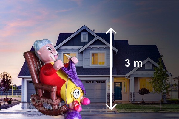 Deze hakende Sarah is door Opblaasfiguurshop zelf ontworpen en geproduceerd waardoor deze uniek in de markt is. De pop is drie meter hoog en valt goed op doordat ze op een grote schommelstoel zit. Deze schommelstoel schommelt niet echt, maar lijkt wel heel echt. De prints zijn net echt hout en door de vele details laat deze unieke breiende Sarah Pop weinig ter verbeelding over.