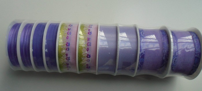 Groot pak met 10 rollen linten met diverse decors en breedte.