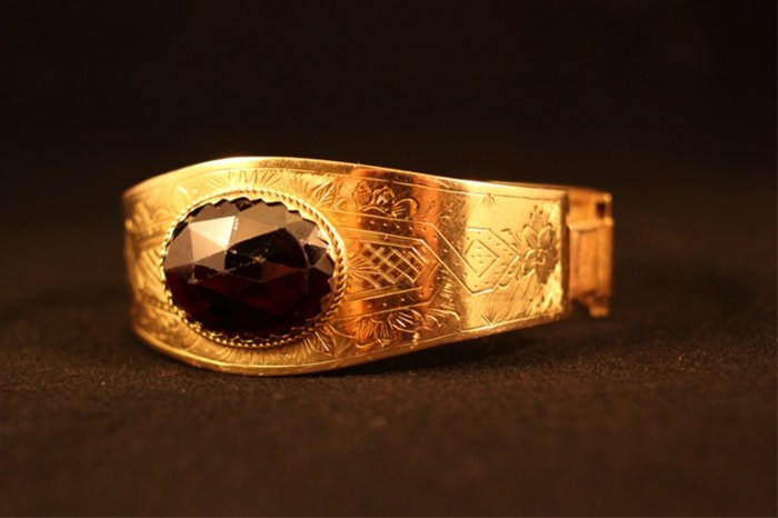 Een prachtig cadeau voor Kerst. Maak uw partner gelukkig ! Deze armband, u kunt het op de foto's zien, hebben zeer aparte tekeningen op de brede band. Het lijkt biedermeier. Bovenop de band ziet u een grote donkerrode granaat. Het is werkelijk een mooi en aantrekkelijke armband. De band is 14 karaat en is voorzien van een goudmerk. De band is getaxeerd boven de 3200,00 euro dus u koopt hem voor een zeer aantrekkelijke prijs. Ook als u hem niet koop prettige Fijne Kerst.