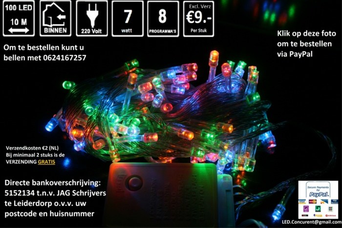 Deze LEDketting van 10 meter lang heeft maar liefst 100 LED lampjes en gebruikt maximaal 7 watt (bij continu branden, knipperen minder).
