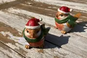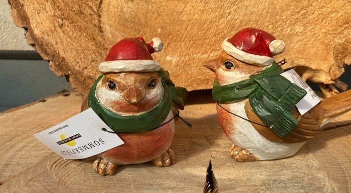 Prachtige houten ornament vogel met kerstmuts met sjaal staande.