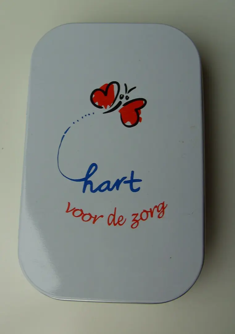 Leuke opberg bewaardoosjes van blik met opdruk “Hart voor de zorg” met vlinder.
