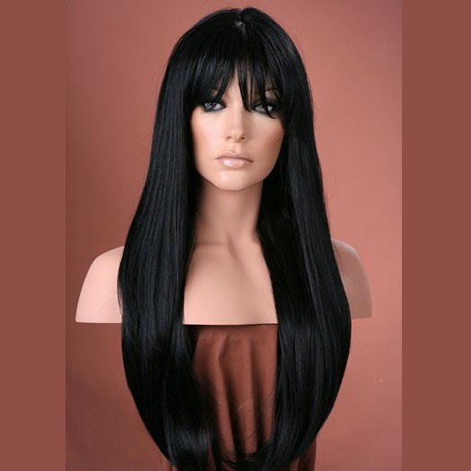 Luxe pruik van hoge kwaliteit met lang steil haar en pony. Scheiding met stukje huidimitatie. Het haar is matig hittebestendig en kan op lage temperatuur worden gestyled.