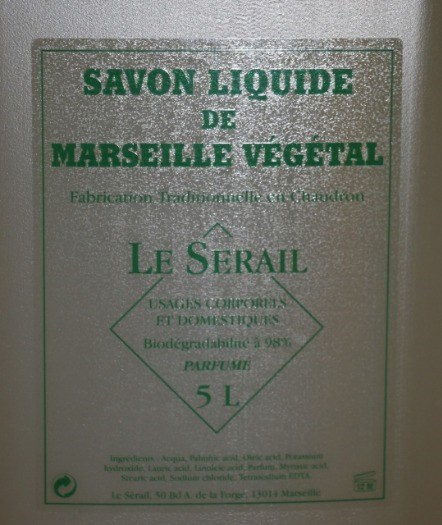 Natuurlijke Vloeibare Franse Marseille Zeep met Plantaardige Oliën. Met de hand gemaakt, gekookt in een ketel door 'Le Serail', geparfumeerd of niet met essentiële olie van lavendel. Verpakt per 3 flacon flessen van 5000 ml per stuk. Ideaal voor lichaamshygiëne.
