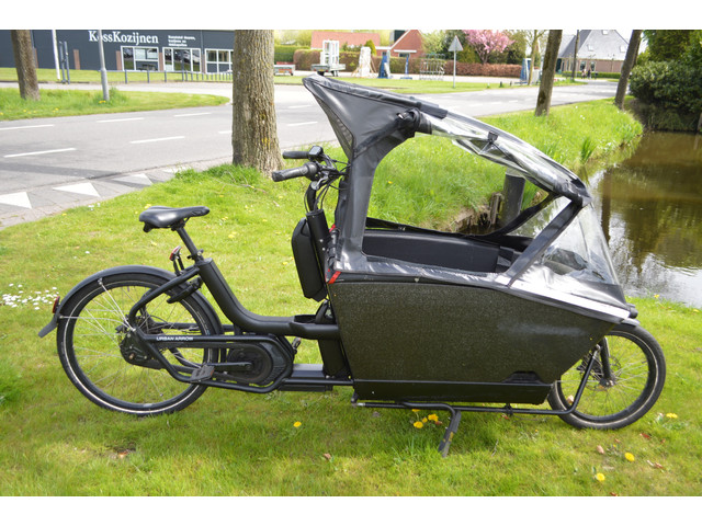 Deze mooie en goede Urban Arrow Family Cargo Line met dubbele accu De huif heeft een scheur in het raam en diverse beschadigingen