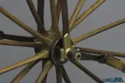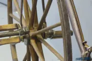 This velocipede has a wrought-iron frame with some original lining visible. The saddle has been repaired and is fastened on a leaf spring. The spoon brake on the rear wheel is operated by turning the flat sprung handlebars. The 34-inch (85 cm) front wheel has wooden spokes, the 28-inch (70 cm) rear wheel has metal spokes. The wheels have plain bearings. Length is 165 cm, handlebar height is 120 cm. This basic boneshaker spent many years in the Falmignoul Collection.