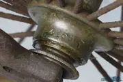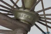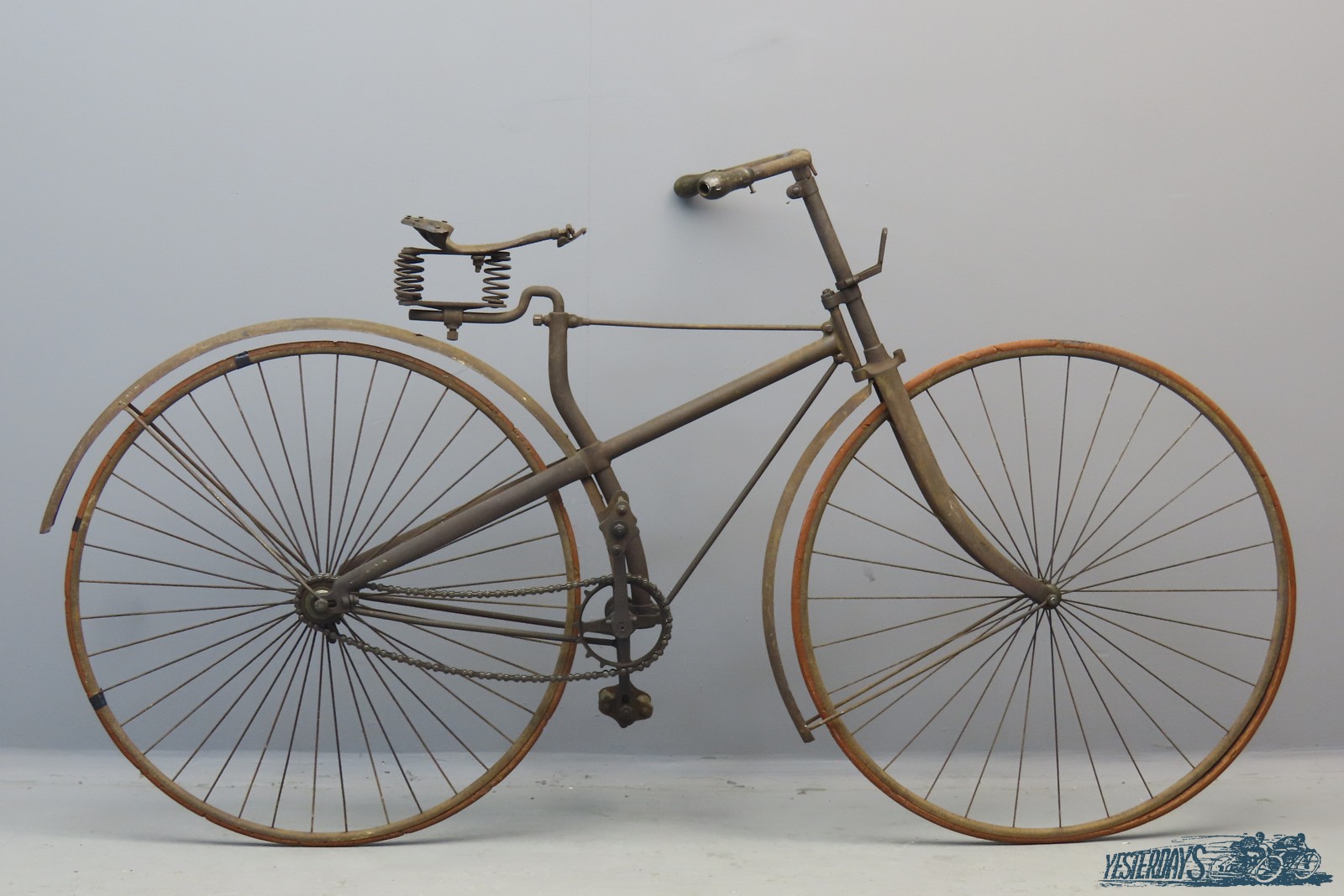 This early safety has a cross frame with steel rod bracing and solid rubber tyres that are somewhat perished. Both wheels are 30-inch diameter with opposed radial spokes. The handlebars have turned pear-shaped grips; the rod brake is not present. Chain and chainwheels have one inch pitch and the pedals are adjustable, with perished rubber blocks. The curved seat bracket is fitted with a spring seat pad that lacks the leather cover. Both front and rear mudguards are present. A nice machine with some surface rust. All the main parts are numbered: wheel hubs, handle bar, bracket, frame.