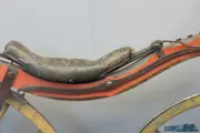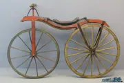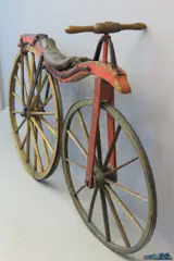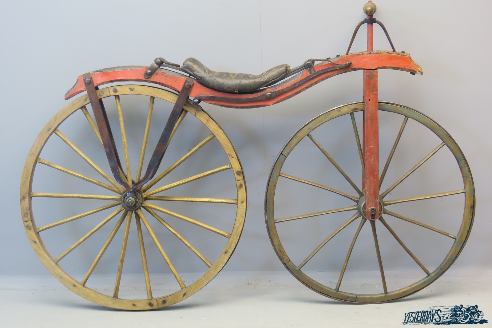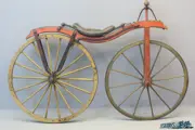Very few original Draisines exist; our machine still has her original body but saddle, wheels and fork are later items. She once belonged to the collection of the Belgian Musée du Cycle in Falmignoul. Front wheel diameter is ca 80 cm, rear wheel diameter ca 75 cm, handlebar height 110 cm.
