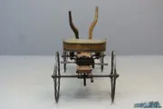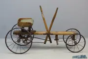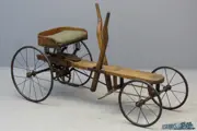 This children’s vehicle has survived in complete and original condition, which is pretty rare. It has got feet-steering via the front wheel axle and is propelled by pushing and pulling wooden levers that are connected to a set of cogwheels that drive the rear wheel. The sprung seat is adjustable and the total length of the vehicle is 130 cm, height of drawbars 70 cm. The front wheels have a diameter of ca 30 cm, the rear wheels are ca 40 cm in diameter. This very well preserved children’s toy vehicle has been displayed for years in the collection of Mr Wouters of the Musée du Cycle in Falmignoul, Belgium.