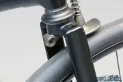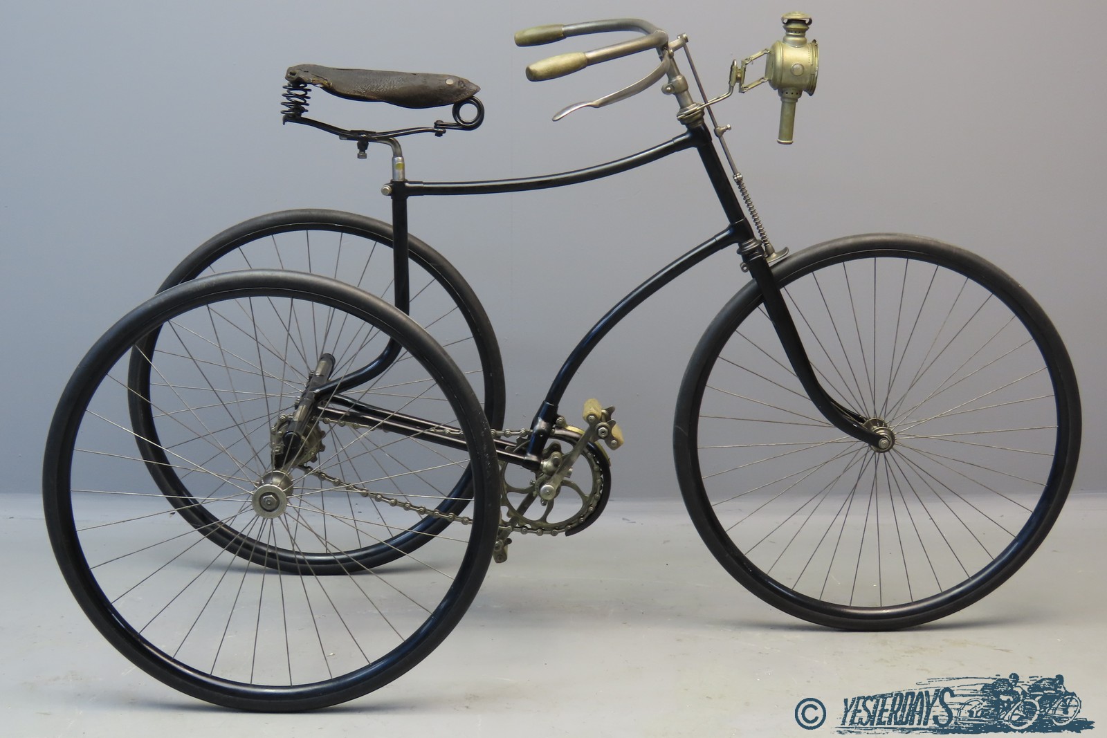 This tricycle is an older restoration in nice condition. It’s fitted with 28-inch wheels with solid rubber tyres, a front brake and a chain guard. The handlebars have bone handgrips and lighting is provided by a “Germania” candle lamp.