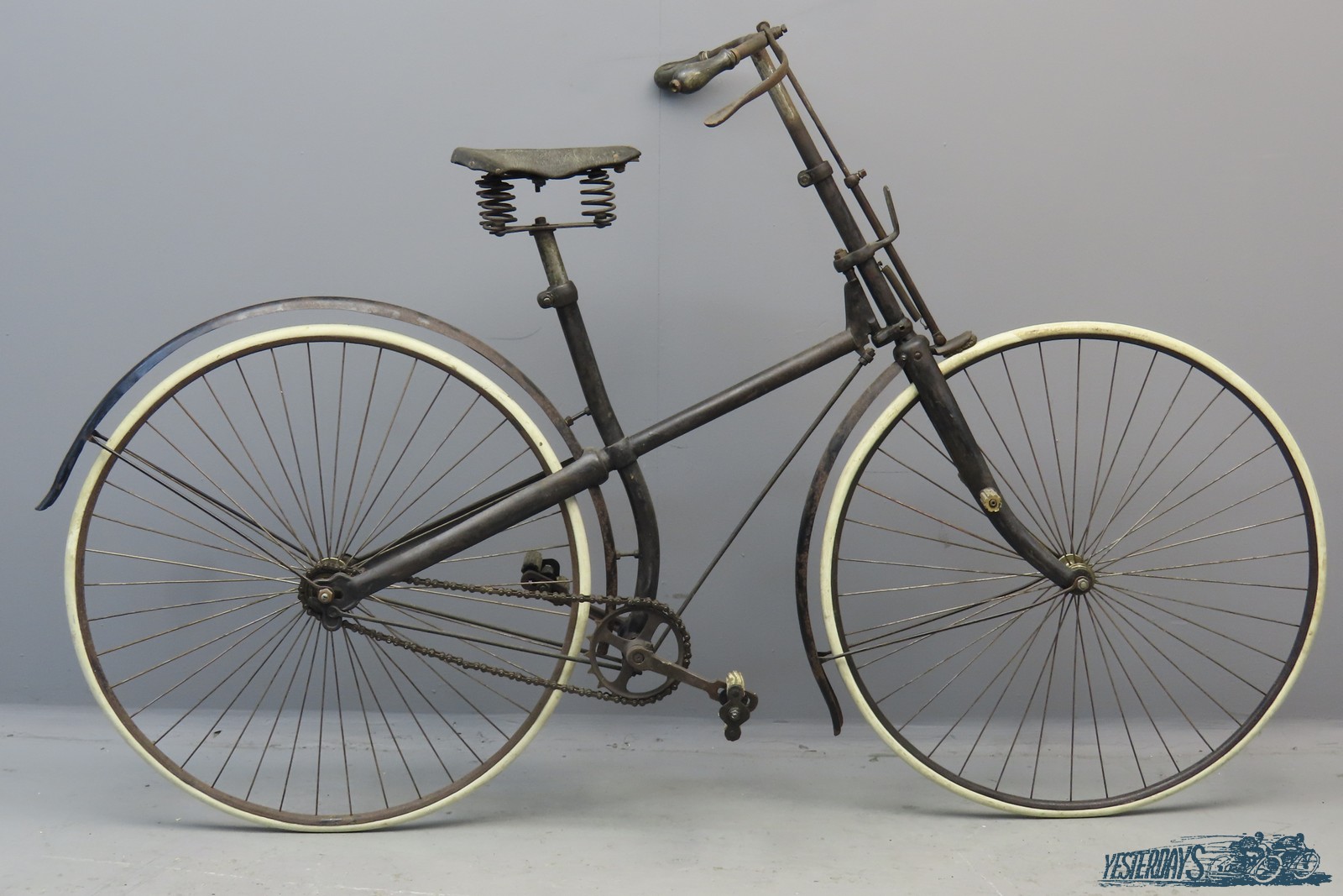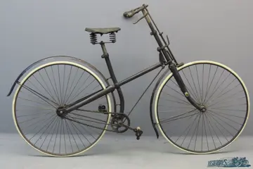The safety bicycle was the successor to the legendary high bicycle: the penny farthing. This early model of a cross-frame safety bicycle was made around 1889. It has 30 inch wheels and solid rubber tyres. The bicycle still has all kinds of features that are reminiscent of the high bicycle, such as the direct spokes, the simple pedals and the steering. The bicycle, with frame number 644, was made by George Townsend in Redditch (UK), in the same factory where Royal Enfield later built bicycles and motorcycles. Beautiful details are for instance the water buffalo horn handles, the elegant brake lever and the heavy chain. In a sales brochure of George Townsend it is mentioned as the model ‘Ecossais’, which is, strange at it seems, the French word for ‘Scottish’.