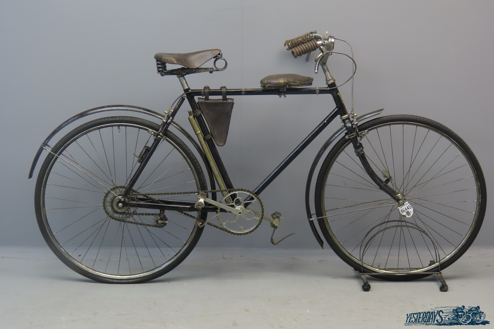 The bike comes with 28-ich wheels, original “MF” saddle, MF cyclometer, tyre pump, “Brennabor” tool pouch, lock on rear wheel, child’s seat, and pocket watch in holder on handlebars. Further accessories include a bicycle bell with inscription “CH Feraud Cycles, Sisteron”, an enamel Belgian tax plate for 1912 issued in the county of Hainault and a Powell and Hanmer “Revenge” acetylene front lamp.
