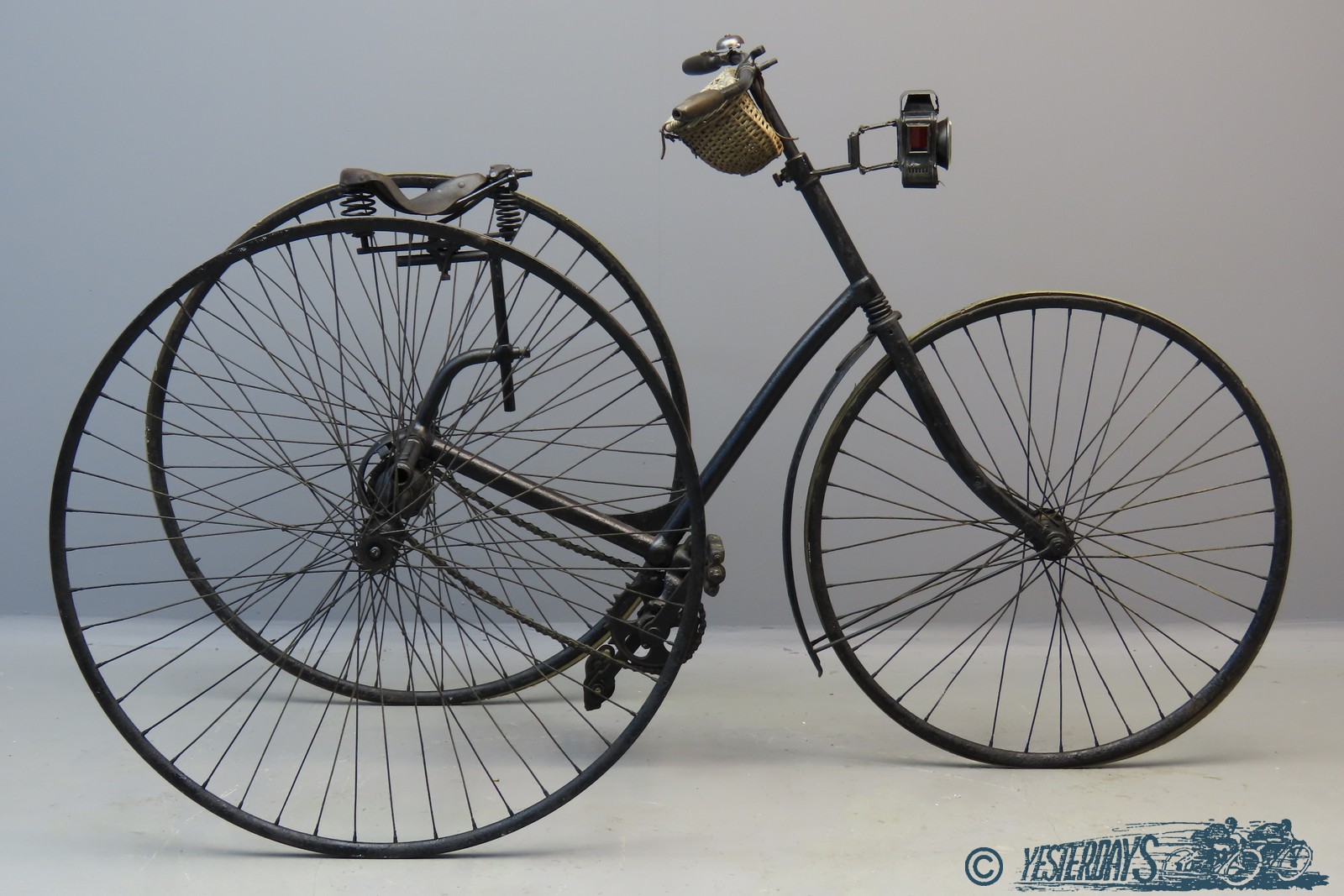 This Ladies’ Safety Tricycle is unrestored but complete, apart from the tyres. It’s fitted with a Hammock saddle with good leather top, wickerwork basket, sprung front forks, bone handgrips, Cyclight oil lamp and period bicycle bell. Front wheel is 30-inch, rear wheels 32-inch.