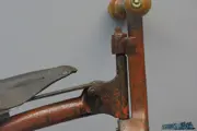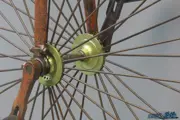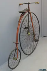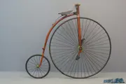 This sturdily-constructed ordinary has a 44-inch ( 112 cm) driving wheel and an 18-inch rear wheel. It has double steps, thick spokes and straight handlebars. She was once part of the falmignoul Museum Bicycle Collection.