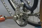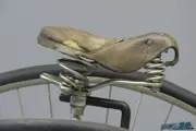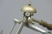 The tricycle we present here has been restored and spent many years in the Falmignoul bicycle museum in Belgium. She has radial spoked wheels with solid rubber tyres and a block chain with Abingdon chain tensioner. The saddle is a Lepper Bielefeld Universal. Behind the rear axle we find a pannier rack with wooden case and leather straps. Further accessories are a handlebar-mounted pocket watch and a nicely adorned period cycle bell. Braking is effected by a spoon brake on the 36-inch front wheel; rear wheel diameter is 34 inch. Length of the tricycle is 170 cm, width 93 cm and handlebar height 100 cm