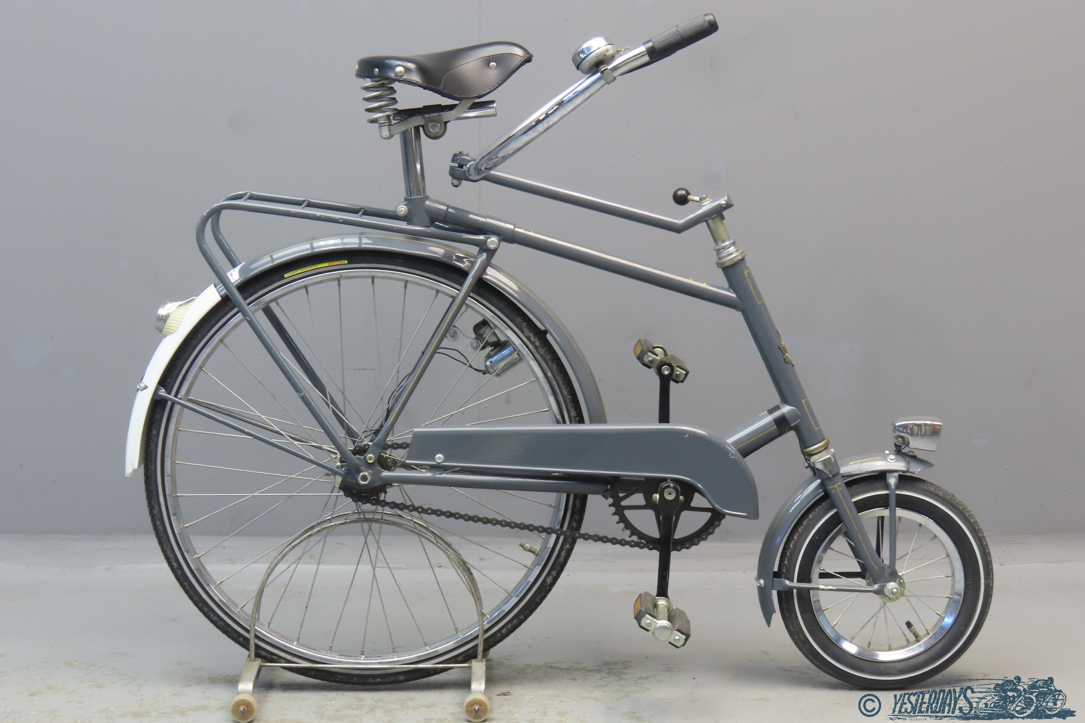 In 1933, Ernesto Pettazzoni, an engineer from Bologna, Italy, had applied for a British patent for his ultra-short-wheelbase semi-recumbent machine, the Velocino. It represented a wheelchair chopped in half, with the seat over the normal-sized rear wheel. The tiny front wheel was about 10 inches in diameter. The handlebar was reversible, giving the option of under-seat steering. Mussolini is said to have commissioned the Velocino as a compact, easily stored urban vehicle. The project attracted a lot of attention but was canceled after Italy entered World War II. Among the companies that launched bicycles inspired by his design was Union. The firm introduced their ‘Strano’ in 1964 – designed by Bernard Overing of Deventer. It wasn’t a commercial success and production stopped after about a year. The Strano has a length of only 108 centimeters.
