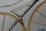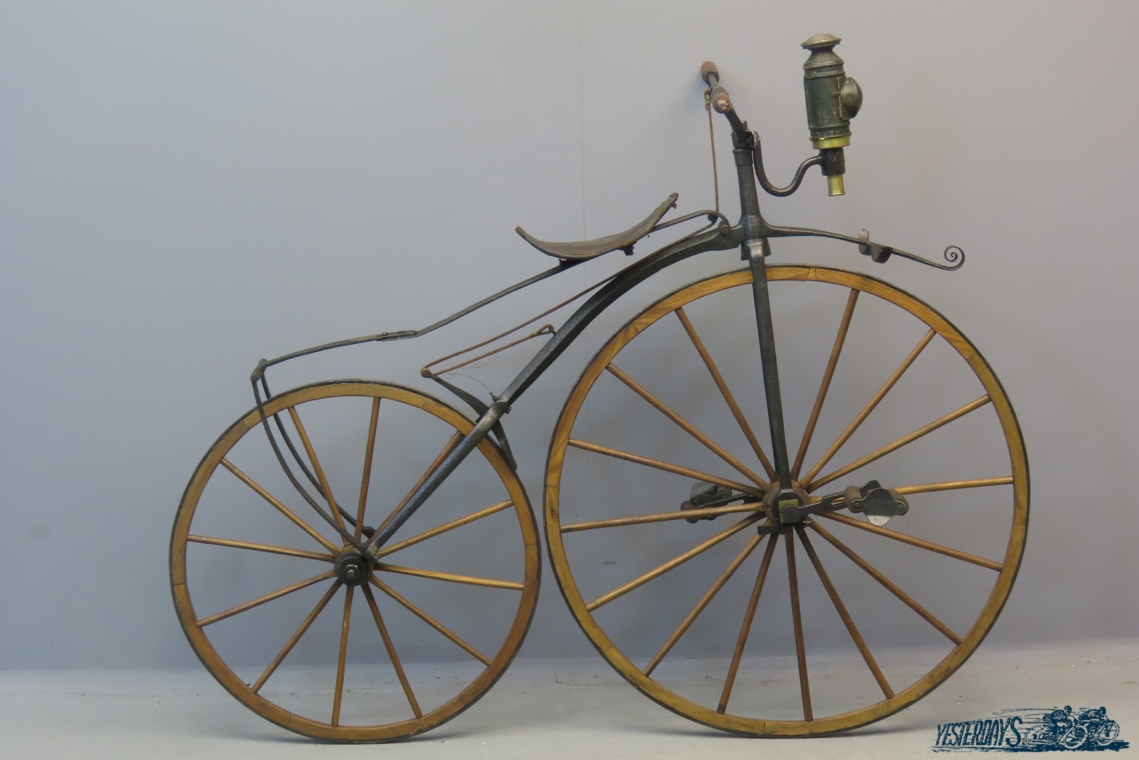 This early Velocipede has restored wheels and plain bronze bearings that are fitted with a lubrication system, a luxury fitment at the time. It’s a graceful design with hock rests and straight handlebars. Turning the handlebars operates the spoon brake on the rear wheel. A Michaux makers’ plate is fitted. The saddle appears to be original, it’s fastened on a broken and repaired spring. Overall length is 150 cm, handlebar height 120 cm. Wheel sizes are 90 and 70 cm. A H. Luchaire candle lamp completes this early bicycle, that once was part of the collection of the Falmignoul Cycle Museum.