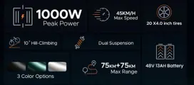Max Mileage: 55KM in electric mode 1 and 75KM in PAS mode 1