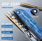 ROMOVABLE LITHIUM-ION BATTERY: The bike has a 36 V 10 Ah lithium-ion battery attached to its frame; the battery is removable and can reach a range of up to 40-50 km per charge (which is 5-6 hours), and you can recharge it on or off the bike.
