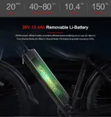 The 10.4Ah / 36V Li-ion battery offers 25-35km in pure electric mode, 40-80km in moped mode.
