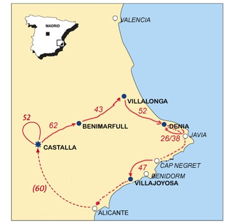 De eerste twee nachten verblijft u in Castalla in een kleinschalig guesthouse. Er is de mogelijkheid om direct van het vliegveld daarheen te fietsen of u maakt gebruik van een autotransfer. Vanuit Castalla zijn meerdere rondritten te maken waarin delen Via Verdes zijn opgenomen. U kunt van daaruit eventueel de mooie stad Alicante bezoeken. Van Castalla fietsen we via de voormalige spoorlijn Xixarra naar Benimarfull. U fietst door het natuurgebied Siërra de Mariola en passeert kleine Arabische bergdorpjes. Vanuit Benimarfull gaan we via het schitterende plaatsje Planes naar het indrukwekkende stuwmeer bij Beniarres. Vanaf Beniarres pakken we de spoorlijn Serpis op, genoemd naar de rivier die u vele kilometers zal vergezellen. Deze dag zal een van de hoogtepunten worden van deze week. Het spoortraject wurmt zich hier als een slang dwars door het gebergte richting de Middellandse Zee. Na een overnachting in Villalonga gaan we verder via het dal van Gallinera naar zeeniveau, naar Denia. Het altijd gezellige Denia, vanwege de veerdiensten die daar vertrekken naar de Balearen, de gezellig terrasjes en de locale markten. Van hieruit hebben wij een prachtige rondrit uitgezet door het natuurpark “Montgo”. Deze valt in de zomermaanden te combineren met een boottocht langs indrukwekkende kliffen. Na alleen nog maar kennis gemaakt te hebben met voormalige spoorlijnen maken we nu kennis met nog een bestaand spoor. Van Alicante naar Denia loopt een treintje, hiervan maken wij gebruik om bij het laatste fietsvertrekpunt van deze week te komen. De fiets mag mee de trein in. Vooral de vele vergezichten op zowel de bergen als de zee maken deze treinrit bijzonder. Vanuit Altea fietsen we naar Villajoyosa, bekend om zijn veelkleurig gevels in de smalle straten. Van hieruit wordt u weer naar het vliegveld gebracht.