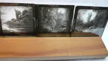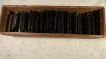 Kistje zonder deksel, met maar liefst 115 enkelglasdia's met sublieme tekeningen uit de serie "Die Bibel in Bilder". Het betreft een deel van de complete serie , bestaande uit meerdere series van 24. Verreweg de meeste dia's zijn in een goede staat, een stuk of 10 missen een stukje glas of zijn wat verlopen: