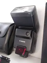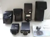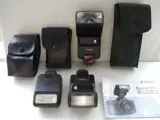Een Canon Speedlite 200E, een 300EZ, en een Canon Speedlite 420EZ automatische flitsers voor Canon EOS camera's, uitgebracht met analoge EOS camera's
