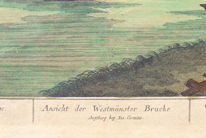 Handgekleurd blad uit de collectie van 120 bladen met kijkgatafbeeldingen van de Augsburgse uitgeverij Carmine. Zeldzaam uitzicht vanuit Londen, dat ook alleen door Carmine is uitgegeven. Gevlekt en gebruind, bros rechtsonder op de afbeelding en met gebreken, bovenaan met montageresten, lichte kniksporen, lichte randoneffenheden.