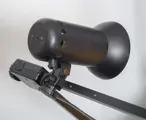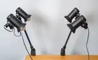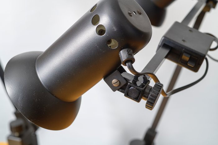 Repro lampenset van Kaiser, type 4389. 4 reflectoren met E27 vatting. Lampen zijn onder allerlei hoeken in te stellen: hoog of laag, links/rechts verplaatsbaar. Verlichtingshoek is in te stellen door verstelbare armen. Deze zijn met een klem op een tafelrand of reproductieapparaat te bevestigen. Lampen zijn afzonderlijk aan of uit te schakelen. Betrouwbare Duitse kwaliteit. Prima staat.