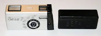 Kiev Vega 2 nr. 67736 met Industar 3.5 / 23 mm. lens en 16 mm. film in bakelieten doosje. Serienr. 67736.