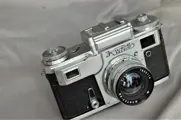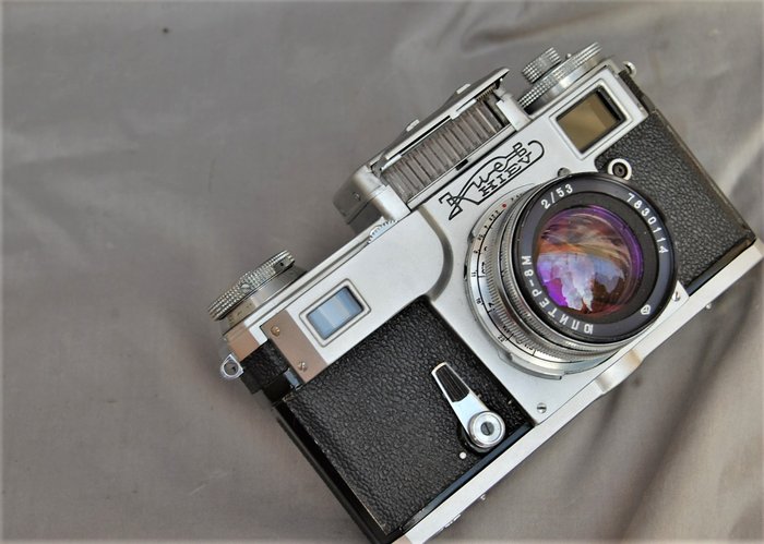 Kneb kiev kleinbeeld camera 35mm film. Camera is in mooie staat, en normaal werkend. Belichtingsmeter slaat goed uit niet op zuiverheid getest. Sluiter goed ook de langere tijden. Meetzoeker werkt. Lens jupiter 2/53 helder stofje mogelijk. Camera is een kopie van de Zeiss ikon Contax. Zie de foto,s deze maken deel uit van de omschrijving.