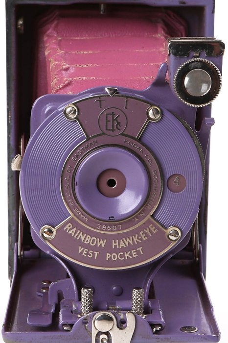 Kodak Rainbow Hawkeye Vest Pocket cameras were in production from 1931 to 1933. They are only made for two years, in contrast to the Vest Pocket Kodaks that are made for 6 years.The film format is also 127 with a negative size of 4 x 6.5 cmThis camera has the original pink bellows, but not light tight. The camera body is metal with a colored hammer-blow pattern. This is the main difference from the Kodak Petites which have fabric covers. The shutter works and the meniscus lens is behind the diaphragm. Don't grab the pins to open the bellows. If the bellows do not slide out easy than just open the camera and push gently on the bellows forward from the inside.