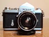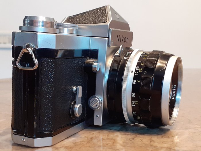 Nikon F met pentaprisma en lens Nikkor -S 35mm f:2.8. Volledig functionele camera met lichte ouderdomssporen. De echte spiegelreflexcamera die door professionals over de hele wereld wordt gebruikt en waarmee fotografie geschiedenis heeft geschreven. Vrij van optische en/of mechanische gebreken.