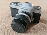Volledig mechanische camera die werkt zonder batterijen. Belichtingsmeter geeft plausibele waarden aan.