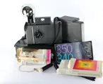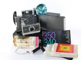 De 340-kit wordt geleverd met handleidingen, een filmcassette in de camera en een ongeopende, bevestigbare flitser, doos met verschillende lampen en draagtas.