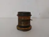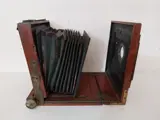 Oude camera uit begin 1900, gedemonteerd, met driepotige driepoot (waarvan er één moet worden vastgemaakt), doka, glas en Rapid Aplanat nr. 3 lens (met sporen, zie foto) Door de driepoot kan de camera worden gepositioneerd op een hoogte van ongeveer 97cm.